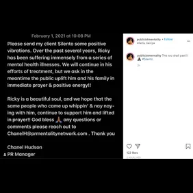 "Please send my client Silento some positive vibrations," wrote Hudson. "Over the past several years, Ricky has been suffering immensely from a series of mental health illnesses. We will continue in his efforts of treatment, but we ask in the meantime the public uplift him and his family in immediate prayer & positive energy!!"
