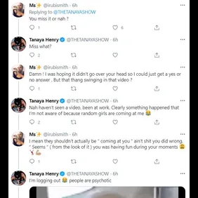 "Folks leaking their personal xxx videos for attention is so cringe," Tanaya wrote. Soon, people began commenting on her post, and one person asked her if she "[missed] it," meaning sex with Songz. Henry seemed confused and replied, "Miss what?" The person said they were talking about the video, again without specifying that they were referring to Songz, but Tanaya acted as if she didn't know what they were talking about.