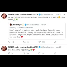 Recently, Tamar tweeted that she would one day meet the man for her, and a fan told Braxton that they wanted to see her back with Adefeso. "Maybe God can fix that," the person wrote. The reality star replied, "He was cheating with his then assistant now cfo since 2019 Jessica [upset side-eye emoji].. God fixed it."