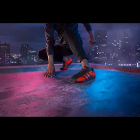 To mark the game's release on the PS5, Marvel and PlayStation have teamed up with Adidas for a brand new colorway of the Adidas Superstar in both high and low-top forms. In the official images below, you can see that Miles wears these shoes in the game and they perfectly match his Spidey suit. The kicks have a red upper all while the three stripes and the toe cap is black. There is even Spider-Man branding on the back heel which helps to bring the entire shoe together, creating a collab that is truly unique.