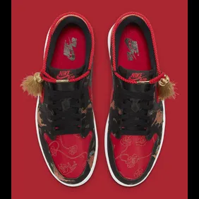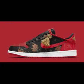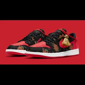 As you can in the official images, the shoe gives off some "Bred" vibes as we are met with black and red materials on the upper. From there, gold ox engravings can be found all the way throughout all while floral patterns can be seen, as well. One of the more interesting inclusions here is a red rope tassel that has some gold on the end of it. This aesthetic meshes well with the overall look of the shoe and adds something you don't typically see from the Jordan 1.