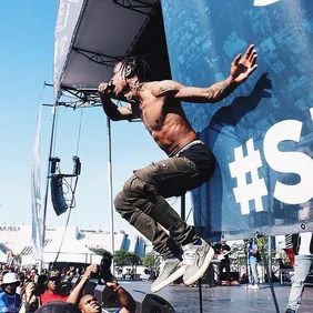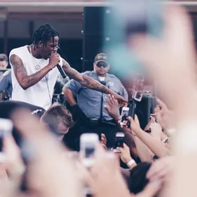 Sometimes his performance shenanigans can be positive, as they were during his and 2 Chainz's performance of "3500" at this year's BET Awards. Scott grabbed one especially excited fan in the front row by the neck and rapped a few bars to him at close quarters before releasing him and stepping off across the stage with his patented high leg kick.
