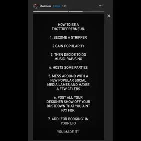 The first step, according to Bow Wow, is to "become a stripper" before "[gaining] popularity." His list goes on to include "3. Then decide to do music. Rap/sing, 4. Host some parties, 5. Mess around with a few popular social media lames and maybe a few celebs, 6. Post all your designer show off your bustdown that you aint pay for., 7. Add 'for booking' in your bio, You made it!"