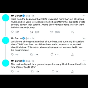 "I said from the beginning that TIDAL was about more than just streaming music, and six years later, it has remained a platform that supports artists at every point in their careers," he said in a new tweet. "Artists deserve better tools to assist them in their creative journey. Jack is one of the greatest minds of our times, and our many discussions about TIDAL’s endless possibilities have made me even more inspired about its future. This shared vision makes me even more excited to join the Square board. This partnership will be a game-changer for many. I look forward to all this new chapter has to offer!"