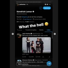 We've officially gotten to a point where people are so desperate for new Kendrick Lamar music that they're flocking to his "likes" on Twitter and going absolutely bonkers when something new pops up. The prolific rapper has been seemingly working behind-the-scenes on his pgLang label, possibly collaborating closely with Baby Keem and other artists, but his first "like" on Twitter has shifted the narrative among his fans, who are now theorizing about a possible collaboration with Jack Harlow.