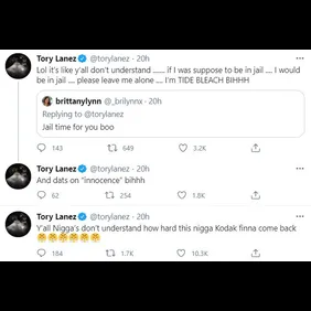 On Friday (February 5), Lanez was attempting to give Kodak Black a bit of a shout out before things went left. “Y’all N*gga’s don’t understand how hard this n*gga Kodak finna come back,” he tweeted with a series of emojis. A woman responded by saying, “Jail time for you boo.” Now, it’s something that Tory Lanez could have simply ignored, but he couldn’t pass up the opportunity to respond.
