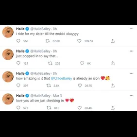 "How amazing is it that @ChloeBailey is already an icon," wrote Halle. "Just popped in to say that .. i ride for my sister till the enddd okayyyy." Considering that Beyoncé has been mentoring both girls should show that they have a long future ahead of them. Check out the tweets, and Knowles's interview, below.