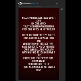 After removing the post from her page, Lisa shared a few more thoughts on her Instagram Story for people who criticized her. "Y'all crabbin cause I said what I said ion give a f*ck," she wrote. "Trust me nobody want him or even give a f*ck he not around. There are just times I'm invited to places I really want to go and when I think of the fact that I have nobody to watch her and I can't even call this n*gga to watch his kid so I can go have a life it pisses me tf off every time I gotta say no so today I got fed up trust me I'm back to not givin a f*ck."