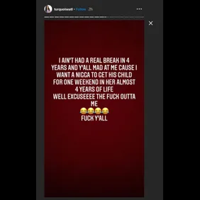 She added, "I ain't had a real break in 4 years and y'all mad at me cause I want a n*gga to get his child for one weekend in her almost 4 years of life well excuseeee the f*ck outta me." After dropping four crying laughing emojis she ended her message by writing "f*ck y'all." Check it out below.