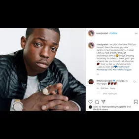 "I wouldn’t be here RN if yu Haven’t been the same genuine person I meet in elementary," wrote Rebel. "I never Seen yu fold or bend through treacherous time’s always thinking Nd doing for others. I thank god I got a friend like you I could call a brother [100 emoji] I love yu like yu My Mama Kids ....see yu soon kid[blue heart emoji] #stillfreegs9 #freeskrap1090 #IloveAllMyN*ggas."
