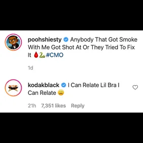 While it appears as though they squashed their beef, a timely comment made by Pooh Shiesty on Monday on social media caught fans off-guard. The "Back In Blood" rapper said the following on Instagram, the same day that news surfaced on the targeted shooting of Kodak Black's entourage: "Anybody That Got Smoke With Me Got Shot At Or They Tried To Fix It." Considering the timing of the post, many believed that Pooh might have been dry-snitching on himself. However, Kodak commented on the post, saying, "I Can Relate Lil Bra I Can Relate."