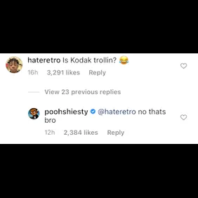 The exchange has left people wondering what the status of their relationship truly is. Are Pooh Shiesty and Kodak Black at war or are they friends? According to Pooh, it's the latter. When somebody asked if Kodak was trolling him, Pooh said that he doubts that's the case. "No that's bro," wrote the Shiesty Season star in response.