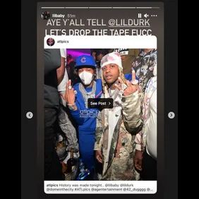 Posting a picture of himself at a party with Lil Durk over the weekend, Lil Baby teased a future collaborative project between himself and the Chicago talent. "Aye y'all tell @lildurk let's drop the tape f*cc," he wrote as his caption, revealing that a mixtape from himself and Smurk either already exists, or is in the works.