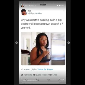 Like many proud mothers, all Kim Kardashian West wanted to do was show off her child's accomplishment. Yet, when you're apart of one of the most famous family's in the world, it's almost impossible to make any moves without facing criticism from the public. Yesterday (February 8), Kim uploaded a photo of seven-year-old North West's latest painting—a piece of art that many people are liking to the stylings of the late-great Bob Ross. Yet, there were people who used the opportunity to accuse the media mogul of lying about her daughter's artistic abilities, and to say that Kim wasn't having it is an understatement.