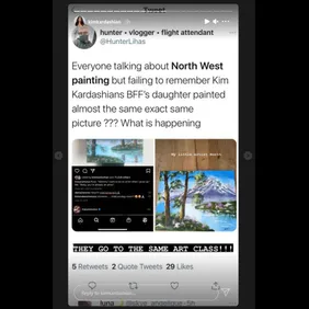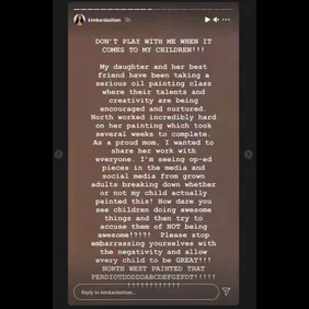 "DON'T PLAY WITH ME WHEN IT COMES TO MY CHILDREN!!!" the reality star wrote on her Instagram Story. People took to social media to say that North's art was eerily similar to Kim's best friend's child's work. "My daughter and her best friend have been taking a serious oil painting class where their talents and creativity are being encouraged and nurtured. North worked incredibly hard on her painting which took several weeks to complete."