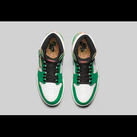 The "Lucky Green" colorway will be a women's exclusive and as you can see from the images below, it is heavily inspired by the Celtics. The main part of the upper is white, while the overlays are green. From there, we are met with a black tongue and Nike swoosh, as well as a red Wings logo to change things up. Overall, it's a unique colorway that works well with this silhouette.