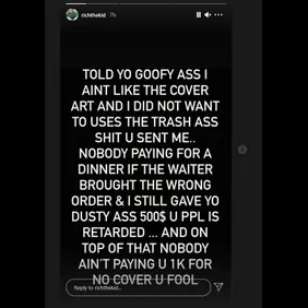 "Told yo goofy ass I aint like the cover art and I did not want to uses the trash ass sh*t u sent me," said the rapper. "Nobody paying for a dinner if the waiter brought the wrong order & I still gave yo dusty ass 500$ u ppl is r*tarded ... and on top of that nobody ain't paying u 1K for no cover u fool."