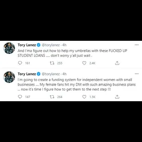 "I'm going to create a funding system for independent women with small businesses," tweeted Lanez. "My female fans hit my DM with such amazing business plans ... now it's time I figure how to get them to the next step !!!" He returned to add, "And I’ma figure out how to help my umbrellas with these FUCKED UP STUDENT LOANS ..... don’t worry y’all just wait."