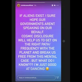 Sharing his thoughts on Instagram Stories, CB said, "If aliens exist, I sure hope our governments aren't speaking on our behalf. Cosmic disclosure will help us to get on the right path/frequency with the planet and break us free from this mental cage. But what do I know??? I'm just good at dancing."