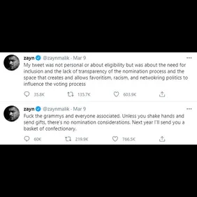 Former One Direction singer Zayn Malik woke up and chose verbal violence with The Recording Academy on Tuesday (March 9) and tweeted his frustrations with the award ceremony. "F*ck the grammys and everyone associated," wrote the singer. "Unless you shake hands and send gifts, there’s no nomination considerations. Next year I’ll send you a basket of confectionary."