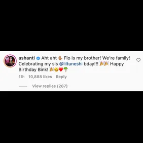 When TheShadeRoom reported on the possible romance, however, Ashanti quickly shut it down in an Instagram comment. “Aht aht Flo is my brother,” the 40-year-old singer wrote. “We’re family! Celebrating my sis @liltuneshi bday!!! Happy Birthday Bink!” The comment seems like a pretty clear shutdown, and fans appreciated Ashanti’s clarity on the situation. “@ashanti oh okay cuz can’t just anybody be with you. #purrrrr,” one commenter replied. “@ashanti said not today gone with yall bs,” said another.