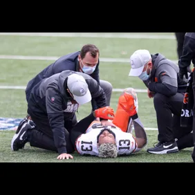 The star wide receiver went down on the Browns' first pass attempt of the game. After an interception, he was injured attempting to tackle Darius Phillips. Browns' training staff escorted him to the locker room afterward.