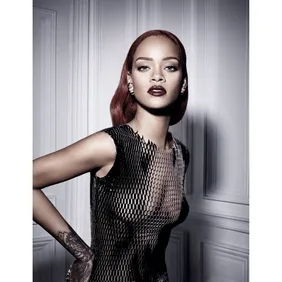 The singer, who was named the face of Dior last year, also became the brand's first black woman to star in a campaign. Continuing to build her relationship with the French label, Rih Rih poses in two different outfits for the "Dior Magazine" photo shoot. The first is a tight-fitting onesie featuring a dark red camo-like print, and the second is a see-through metallic dress, paired with patent leather grey boots.