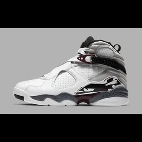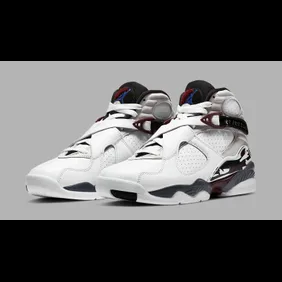 In the official images below, we can see that the sneaker has a white leather upper, all while grey, burgundy, and black are sprinkled throughout. The Jumpman logo on the tongue is a mix of blue and burgundy, which leads to a fairly unique addition to the overall aesthetic. Meanwhile, we are blessed with the Air Jordan 8's signature chunky midsole that acts as reinforced support for all of the ballplayers out there.
