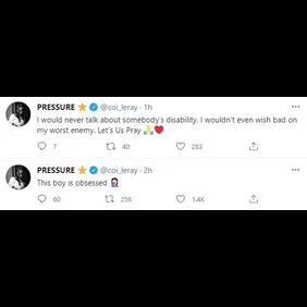 "This boy is obsessed [face palm emoji]," she wrote. "I would never talk about somebody’s disability. I wouldn’t even wish bad on my worst enemy. Let’s Us Pray [praying hands emoji][red heart emoji]." In another tweet, she added, "I feel bad more than being upset. You just have to let go and let GOD fr! Devil will try you!! Outsmart him !!!"