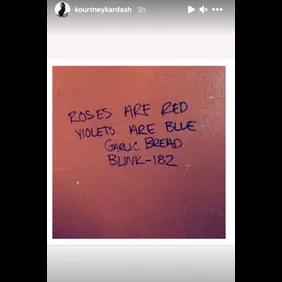 On Sunday evening, they made their relationship "IG Story" official. Both Barker and Kardashian posted photos of a warm, crackling fireplace to their Instagram stories, indicating that they were likely sharing a cozy evening together. Kourtney later posted a short Valentine’s Day poem with a nod to her drummer boyfriend’s band, writing “Roses are red, violets are blue, garlic bread, Blink-182.” Travis also posted a photo to his Instagram story of what was seemingly Kourtney’s ankle wearing a diamond anklet. Could this be a possible Valentine’s Day gift?