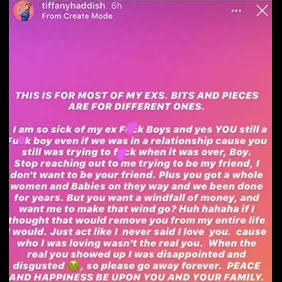 "I am so sick of my ex F*ck Boys and yes YOU still a F*ck boy even if we was in a relationship cause you still was trying to f*ck when it was over, Boy," she penned. She went on to say that the person has a woman "and Babies on they way and we been done for years. But you want a windfall of money." She told that person to act like "I never said I love you. cause who I was loving wasn't the real you."