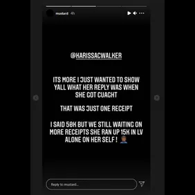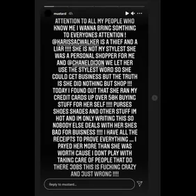 "Attention to all my people who know me I wanna bring something up everyones attention !" Mustard wrote. "@KarissaCWalker is a thief and a liar !!!! She is not my stylest she was a personal shopper for me and @ChanelDijon we let her use the stylest word so she could get business but the truth is she did nothing but shop !!!"