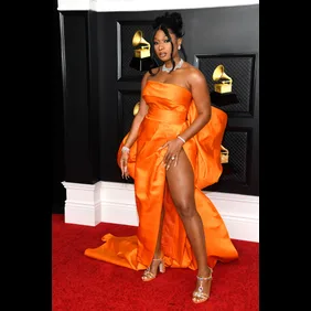 Megan Thee Stallion looked radiant in an orange Dolce & Gabbana number.