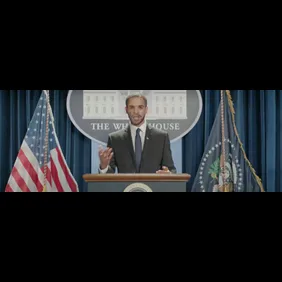 President Barack Obama seems like a more obvious choice, as he stands at the podium delivering an important speech during a press conference ("I got enemies, got a lot of enemies...").