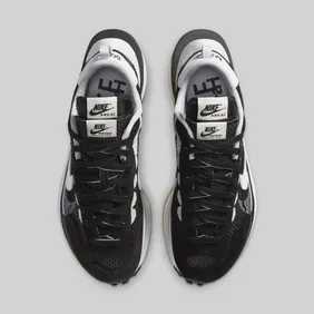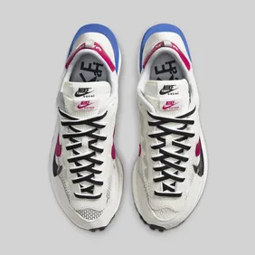 The two colorways are displayed in the official images, which can be found below. The first is a "Sail" model that has a beige upper, all while blue and red highlights are spread throughout. The other offering is a simple black and white model that one would come to expect from any sneaker. As for the aesthetics, the VaporWaffle features a DIY motif to it as the Nike swoosh is layered, all while the back heel extends out like a platform. It's one of those unique silhouettes that Nike and Sacai knock out of the park.