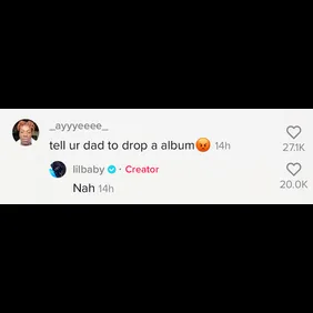 Posting two videos of his kids dancing on the video-sharing platform, Lil Baby was bombarded with comments from fans asking for a new album. "Tell ur dad to drop a album," wrote one fan, directing the comment to Baby's sons Loyal and Jason. "Nah," wrote back the artist.