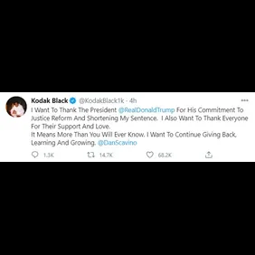 Earlier today, Bradford Cohen, lawyer to both Kodak and Wayne, issued a statement about his clients. "President Trump and his administration have been tireless advocates on behalf of the African-American community," said Cohen. "These pardons is [sic] a perfect example of this administration following up on its reforms and commitments. Thank you to President Trump for his advocacy and dedication to justice reform."