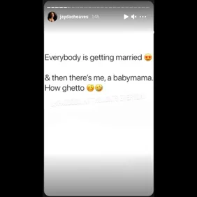 "Everybody is getting married...& then there's me, a babymama. How ghetto," Jayda's post reads. The story post came complete with several emojis, showing that it was merely posted in jest. To further show how funny she thought the meme was, Jayda left a quick message below the picture, albiet in a practically invisible white font.