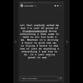 "Not that anybody asked me but I'm just SO proud of @londonondatrack doing everything & then some to tend to all his kids & me," the singer wrote on her Instagram Story. "Whether it's driving 4 hours to pick one up, or flying 4 hours to see one or just do anything & everything I ask him to do. It's just really great to see [black heart emoji]."