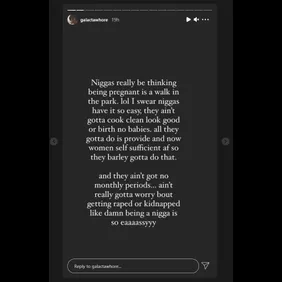 "N*ggas really be thinking being pregnant is a walk in the park," wrote the singer on her Instagram Story. "Lol I swear n*ggas have it so easy, they ain't gotta cook clean look good or birth no babies. all they gotta do is provide and now women self sufficient af so they barley gotta do that." She added, "And they ain't got no monthly periods.. ain't really gotta worry bout getting raped or kidnapped like dame being a n*gga is so eaaaassyyy."