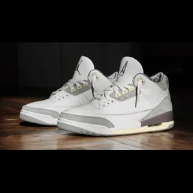 This shoe has been teased for a while, although fans had yet to see any real official images. Well, that all changed recently as A Ma Maniére came through with some photos of their new Air Jordan 3. As you can see, the sneaker has a white leather upper, all while grey suede overlays are placed at the toe box and back heel. Some violet is on the midsole, all while the inside of the shoe is quilted. The right shoe has a Jumpman logo on the tongue, and the left tongue has the A Ma Maniére "A."