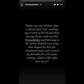 "Waking up to artist of the decade then having dinner with my idol @ronaldisley and listening to the stories behind every song that shaped my love for emotional music and created my formula for a lot of my writing," Drake continued in his story post. "High on life right now my g'z."