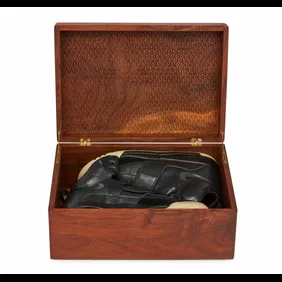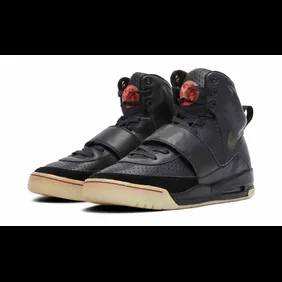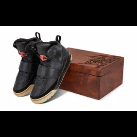 The shoe in question is the Nike Air Yeezy 1 Grammy sample from all the way back in 2008. As you can see below, the shoe is mostly made out of black leather all while a red lace holder is placed on the tongue. There is a yellowed-out midsole and a beige Nike swoosh near the back. Perhaps the most unique part of the shoe is the packaging which is made out of wood, all while there are carvings on the lid.