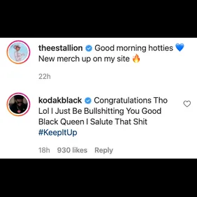 According to a new comment on Megan's Instagram page, Kodak wasn't really too serious about his rant aimed at the three-time Grammy Award winner, stepping back and congratulating her on her history-making night. "Congratulations Tho Lol I Just Be Bullsh*tting You Good Black Queen I Salute That Shit #KeepItUp," he wrote on a post about her new merch.