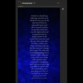 "The other day I said @theweeknd was a lock for either album or song of the year along with countless other reasonable assumptions and it just never goes that way," Drake continued. "This is a great time for somebody to start something new that we can build up over time and pass on to the generations to come." He then named Lil Baby, Pop Smoke, PartyNextDooor, and Popcaan as just a few artists who deserved more credit.