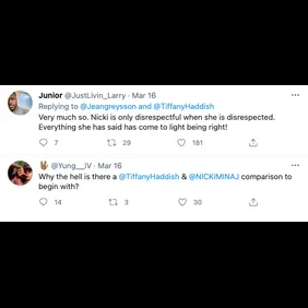 "Why the hell is there a @TiffanyHaddish & @NICKIMINAJ comparison to begin with?" said one of the tweets, which Tiffany co-signed. "Nicki is only disrespectful when she is disrespected. Everything she has said has come to light being right," wrote the second comment that Haddish agreed with.