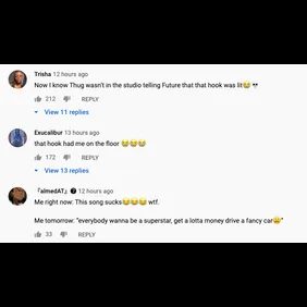 "Future baby your lungs not made for all that singing on Superstar," said one fan on Twitter about the track. "Future for real auditioning for the Backyardigans on Superstar," joked another. Sifting through the comments, it's clear that there are not many fans of the song-- or at least, not many of the people who like the record are being vocal about it. The top comments are all negative, clowning Future for thinking he could extend his range this far.