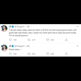 Of course, JT didn't say anything about Minaj or Megan, but Nicki's fans went on to reply with cruel comments, hateful remarks, and malicious memes by the thousands. "Y’all are really really weird & when y’all find out the actual good news," JT tweeted in response to the strange backlash she'd received. "Y’all gone feel real sh*tty! Like I swear my mind don’t be in Stan account mode, I’m an actual person!"
