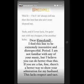 Vanessa Bryant, Kobe's widow, went on to call the bar "disrespectful" and "insensitive". Meek's initial response to her comments was considered "rude" by fans empathizing with the Bryant family, with Meek saying, "I'm going back savage in this sh*t, f*ck ya feelings!" but it seems like the rapper later took time to privately apologize to Vanessa Bryant over his lyrics, claiming so in a follow-up post.