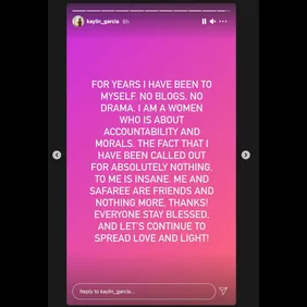 Kaylin Garcia responded by claiming that she's just friends with Safaree, saying, "For years I have been to myself. No blogs. No drama. I am a women who is about accountability and morals. The fact that I have been called out for absolutely nothing, to me is insane. Me and Safaree are friends and nothing more. Thanks! Everyone stay blessed. And let's continue to spread love and light!"